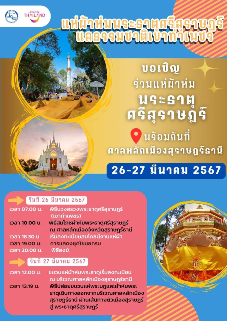 🌟ในวันที่ 26-27 มีนาคมของทุกปี จังหวัดสุราษฎร์ธานี จะจัดงานประเพณีประจำปี ซึ่งเกิดจากแรงศรัทธาของชาวสุราษฎร์ธานี ในงาน “แห่ผ้าห่มพระธาตุศรีสุราษฎร์ แลธรรมชาติเขาท่าเพชร” ภายในงานจะมีพิธีสมโภชผ้าห่มพระธาตุศรีสุราษฎร์ ณ ศาลหลักเมืองสุราษฎร์ธานี และพิธีแห่ผ้าพระบฏและผ้าห่มพระธาตุศรีสุราษฎร์ ณ พระธาตุศรีสุราษฎร์ เขาท่าเพชร