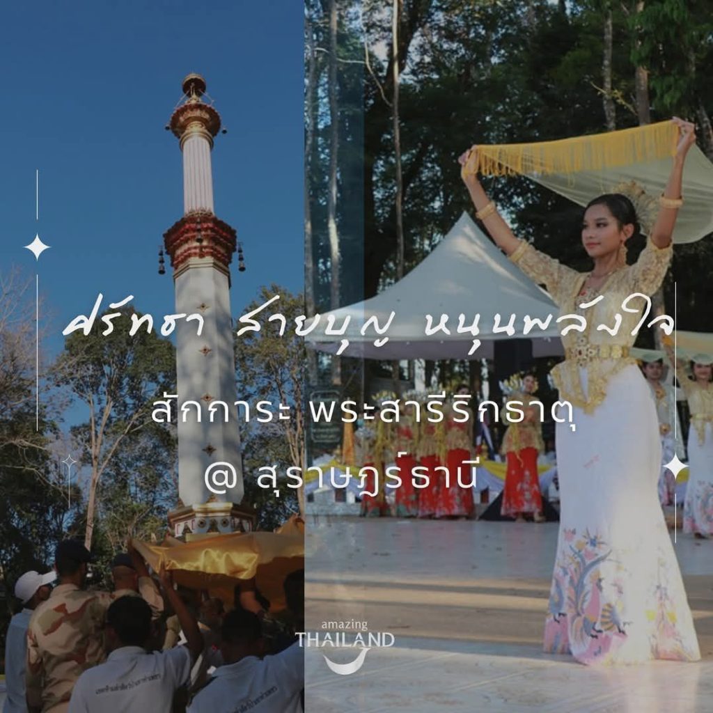 ✨นอกจากการเดินทางเข้าร่วมงานแห่ผ้าห่มพระธาตุศรีสุราษฎร์ แลธรรมชาติเขาท่าเพชร แล้ว สายบุญ สายศรัทธา ยังสามารถเดินทางไปสักการะพระสารีริกธาตุ ณ วัดต่างๆ ของจังหวัดสุราษฎร์ธานี ได้อีกด้วย