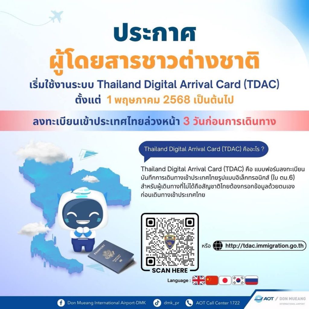 ท่าอากาศยานดอนเมืองพร้อมอำนวยความสะดวกนักท่องเที่ยว ลงทะเบียน Thailand Digital Arrival Card (TDAC) ล่วงหน้า 3 วันก่อนเข้าไทย เริ่ม 1 พ.ค.68