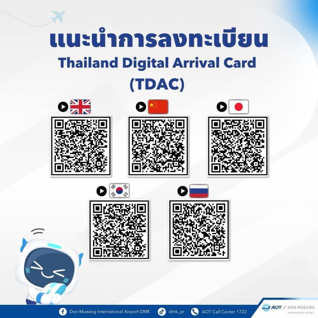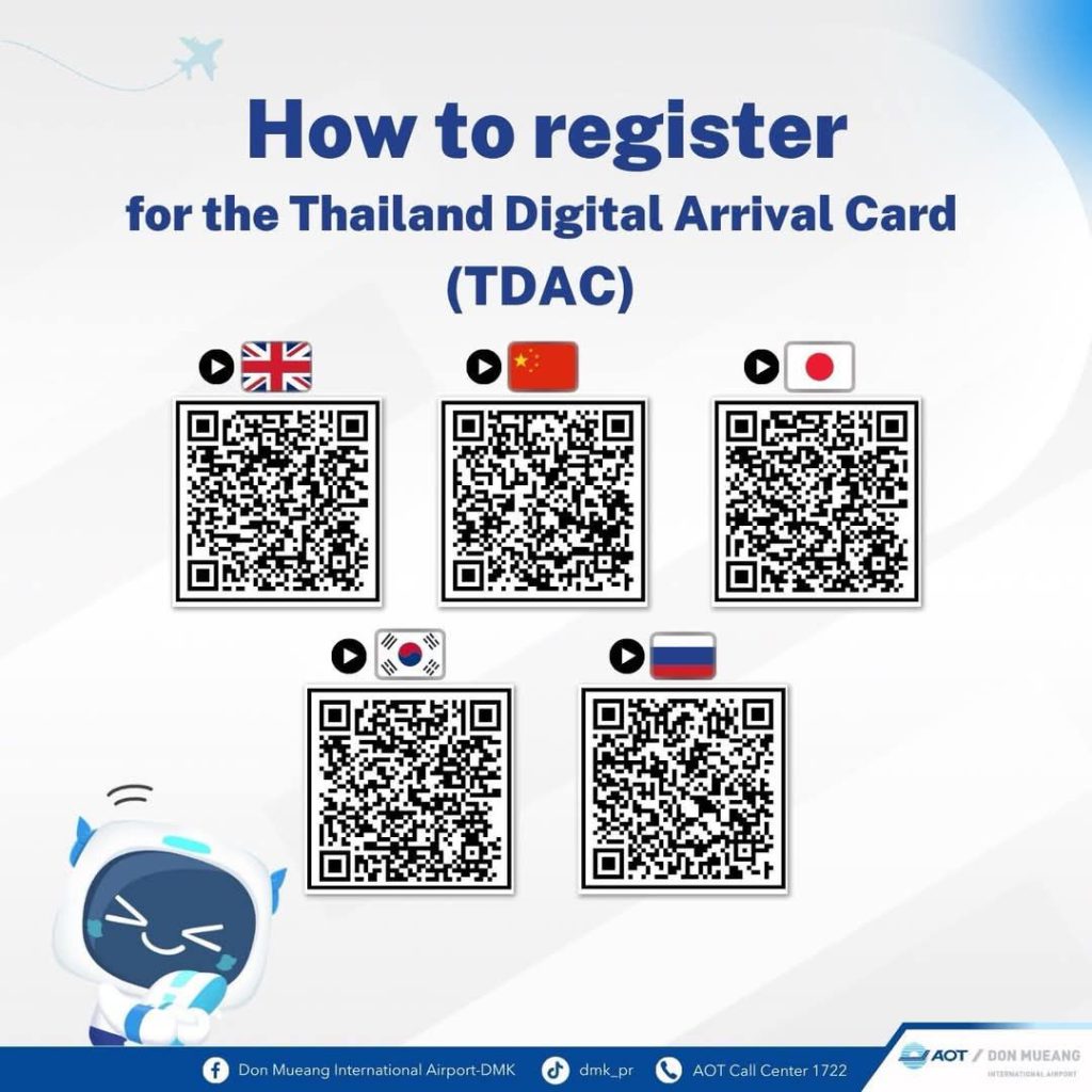 โดยการลงทะเบียน TDAC จะช่วยลดขั้นตอน ลดเอกสารของกระบวนการตรวจคนเข้าเมือง อีกทั้งยังเพิ่มความปลอดภัยและสนับสนุนภารกิจด้านความมั่นคงของประเทศไทยได้อย่างมีประสิทธิภาพ และมอบประสบการณ์การเดินทางที่ราบรื่นและสะดวกสบายให้แก่ผู้โดยสารและนักท่องเที่ยวชาวต่างชาติทุกท่าน ผู้โดยสารสามารถลงทะเบียน TDAC ได้ที่เว็บไซต์ https://tdac.immigration.go.th หรือสแกน QR Code ที่ให้ไว้ กรอกข้อมูลส่วนตัว รายละเอียดการเดินทาง และข้อมูลที่พักให้ครบถ้วน ส่งแบบฟอร์ม และรอรับอีเมลยืนยันการลงทะเบียน เมื่อเดินทางเข้าประเทศไทยผู้โดยสารสามารถแสดงอีเมลยืนยันและเอกสารการเดินทางต่อเจ้าหน้าที่ตำรวจตรวจคนเข้าเมือง ณ จุดตรวจคนเข้าเมืองในประเทศไทย